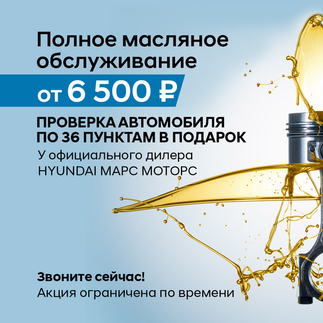 Комплексная диагностика автомобиля Hyundai в подарок при полном масляном обслуживании. Проверьте свой автомобиль по 36 ключевым пунктам и убедитесь в его надежности! Ждем вас в Марс Моторс!